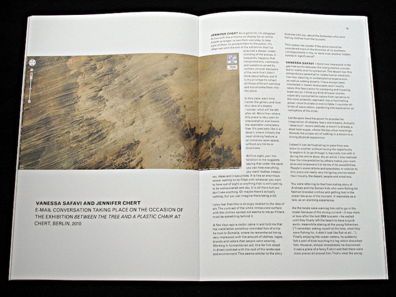 Catalogue published on the occasion of the exhibitions: Vanessa Safavi “Resorts”, Kunsthaus Glarus, August-October 2011 and “Between the Tree and a Plastic Chair”, Vanessa Safavi solo exhibition at Chert, Berlin, September-October 2010.