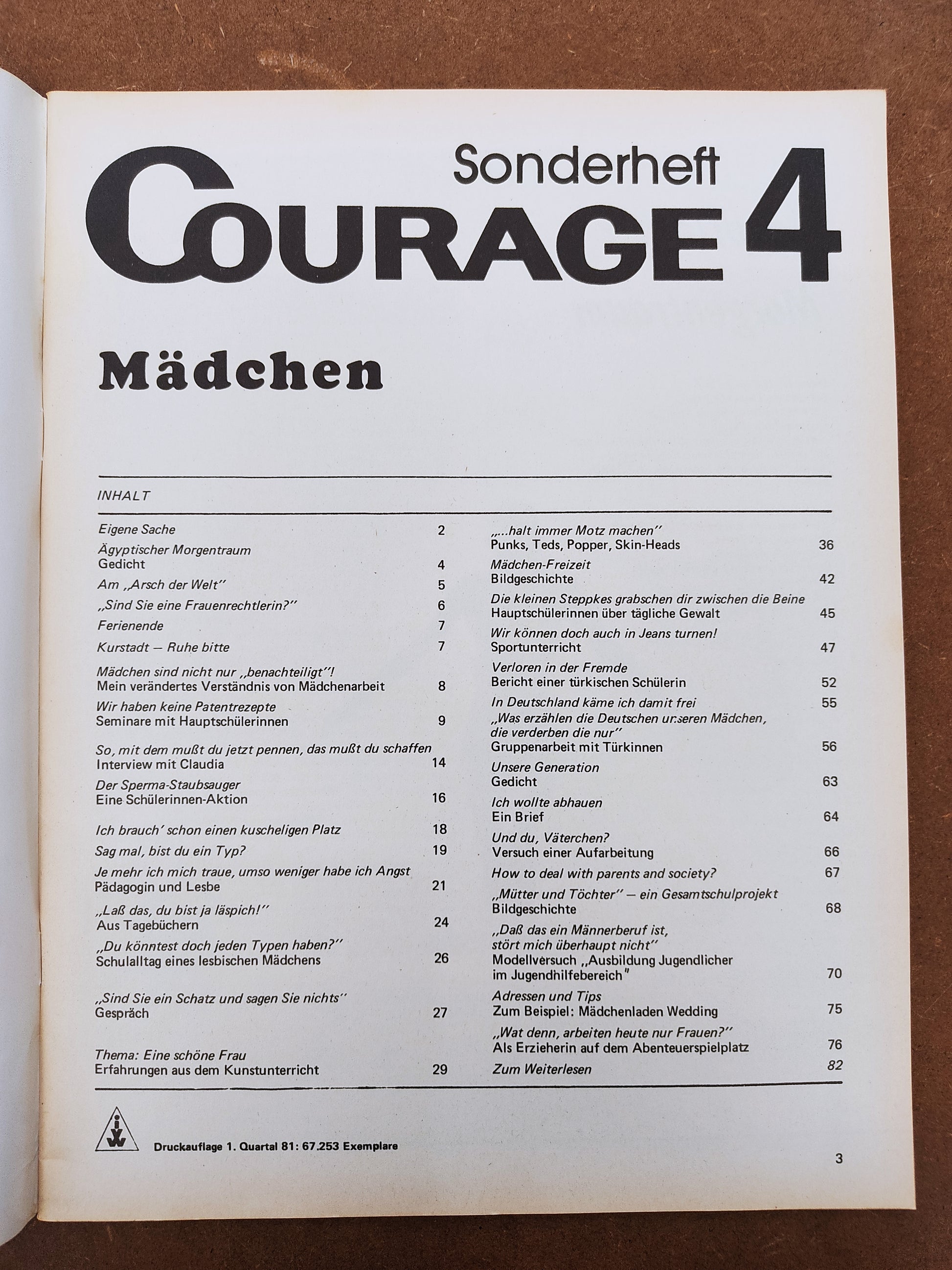 Courage was founded in 1976 by a group of ten Berlin women from the Kreuzberg Women's Centre who wished to create an autonomous leftist-feminist newspaper.