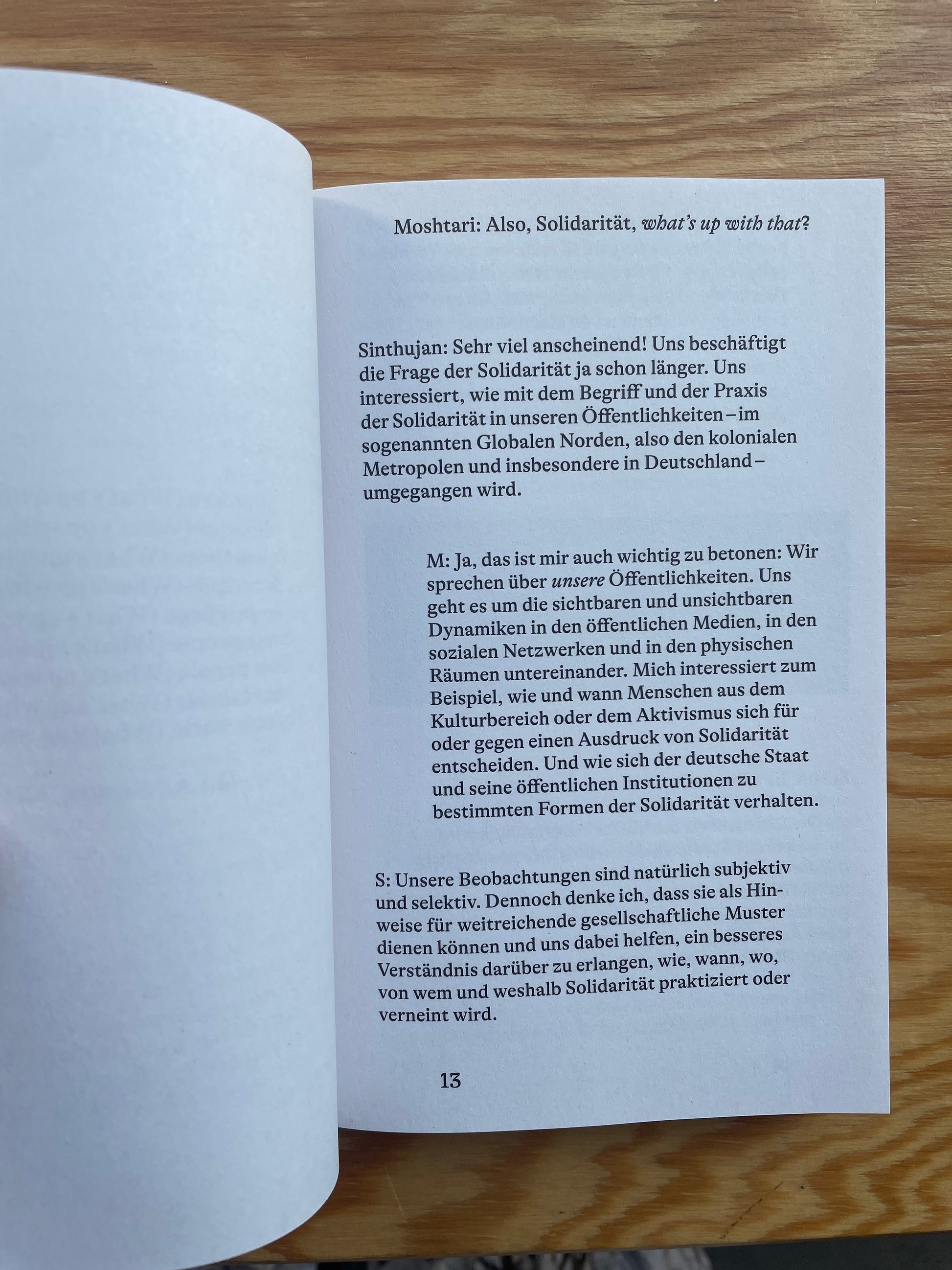 In their new volume Hierarchies of Solidarity, சிந்துஜன் வரதராஜா (Sinthujan Varatharajah) and مشترى هلال (Moshtari Hilal) jointly reflect on a practice that, as an act against oppression, expresses itself in both seemingly small everyday gestures and global political contexts. The result is a revealing conversation that, underpinned by lived experience, traces the racist structures of the discourse landscape and offers alternative ways of understanding solidarity.
