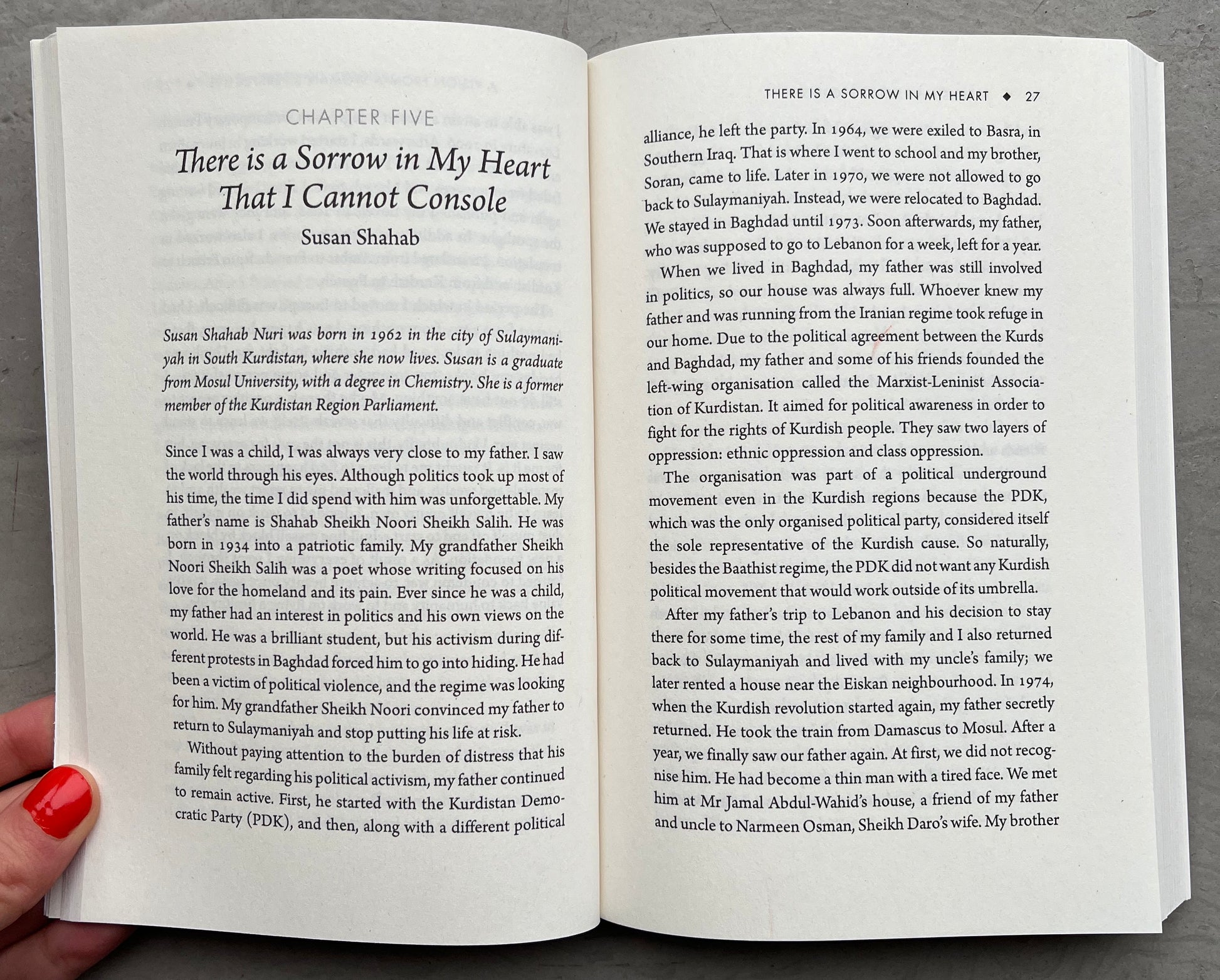 This is a collection of Kurdish women's stories written in their own words. Each story reveals a tapestry of experiences, including political activism under Saddam and armed resistance in Rojava's PKK and YPG and in Rojhalat's Komala. This is in addition to experiences of FGM and overcoming victimhood, life under extreme conservatism, as well as a look into the work of artists, poets, novelists and performers whose work demonstrates a complicated relationship with Kurdistan.