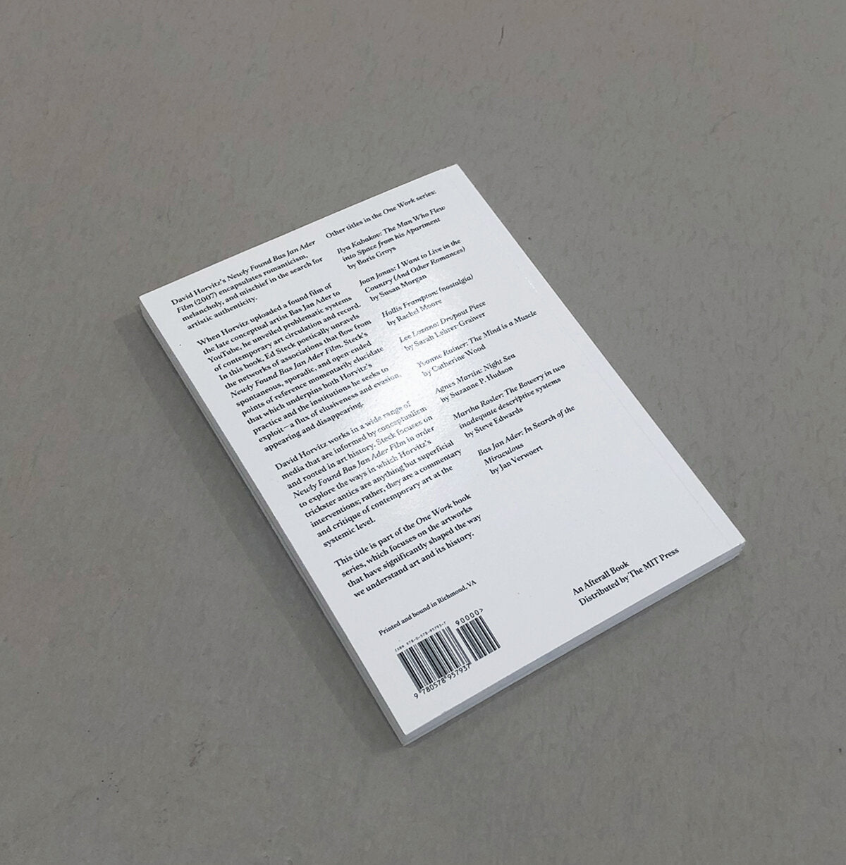 In this book, Ed Steck poetically unravels the networks of associations that flow from Newly Found Bas Jan Ader Film. Steck’s spontaneous, sporadic, and open-ended points of reference momentarily elucidate that which underpins both Horvitz’s practice and the institutions he seeks to exploit—a flux of elusiveness and evasion, appearing and disappearing. David Horvitz works in a wide range of media that are informed by conceptualism and rooted in art history. Steck focuses on Newly Found Bas Jan Ader Film in order to explore the ways in which Horvitz’s trickster antics are anything but superficial interventions; rather, they are a commentary and critique of contemporary art at the systemic level.