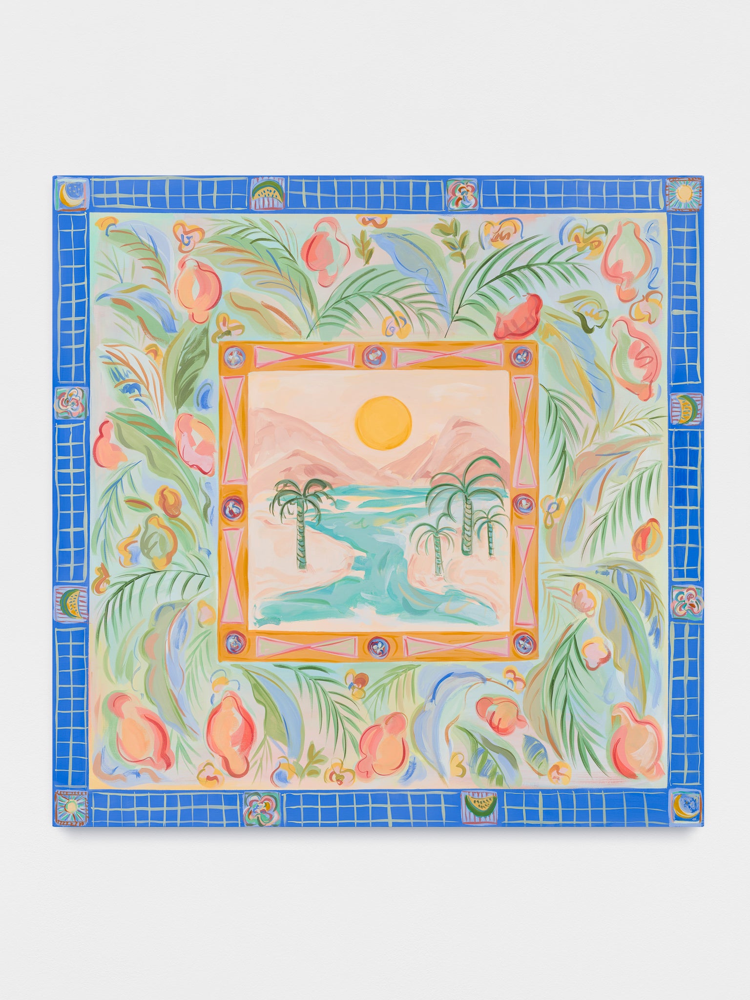 Paisaje sobre seda (Landscape on Silk), 2024 is a special edition silk scarf made by Sol Calero reproducing a full-scale painting. The canvas of the same title shows a landscape typical of the artist' imagery surrounded by different decorated frames, one inside the other. The structures incorporate architectural elements into the natural landscape and decorative vegetation, and they work in symbiosis with different projects typical of Calero's research.