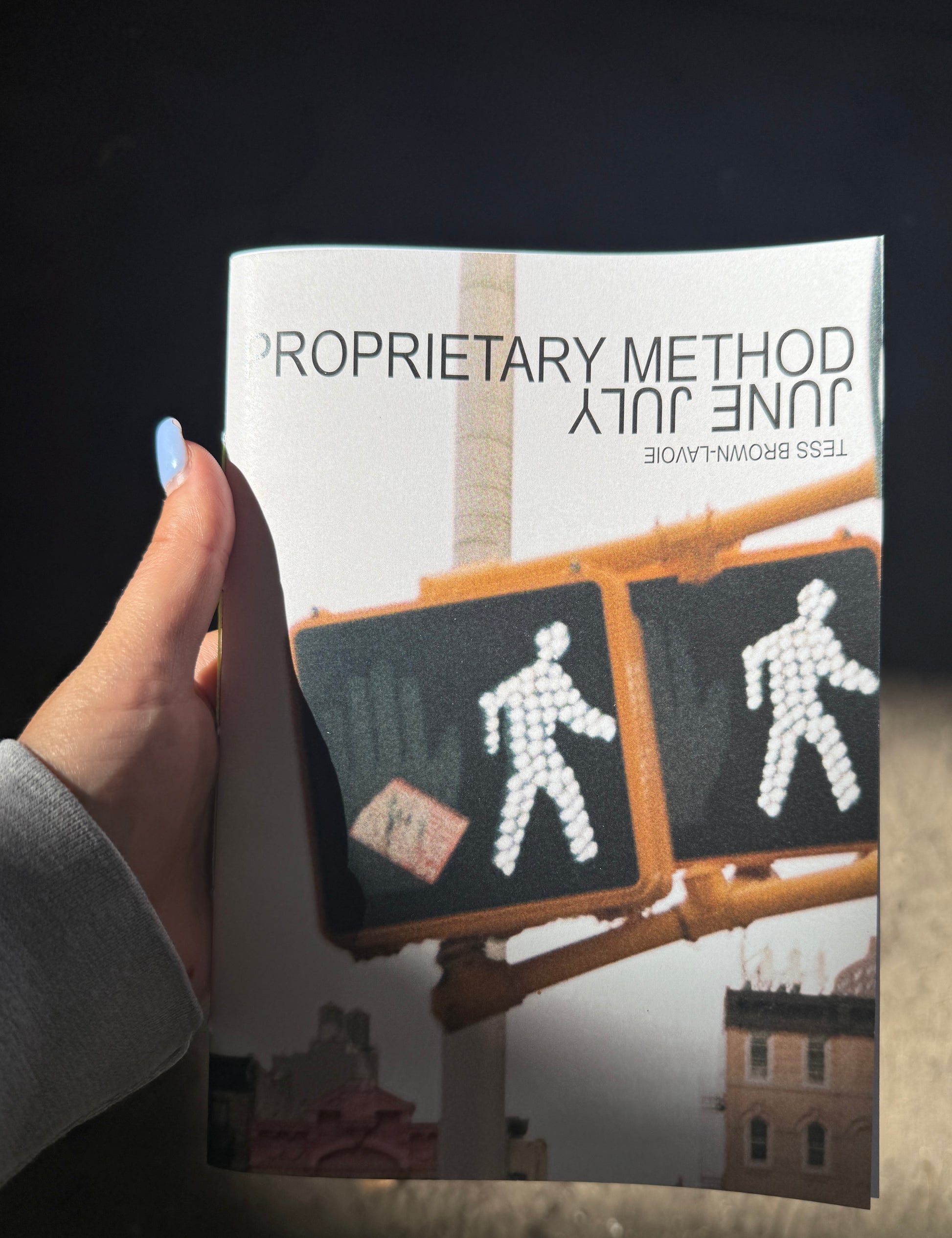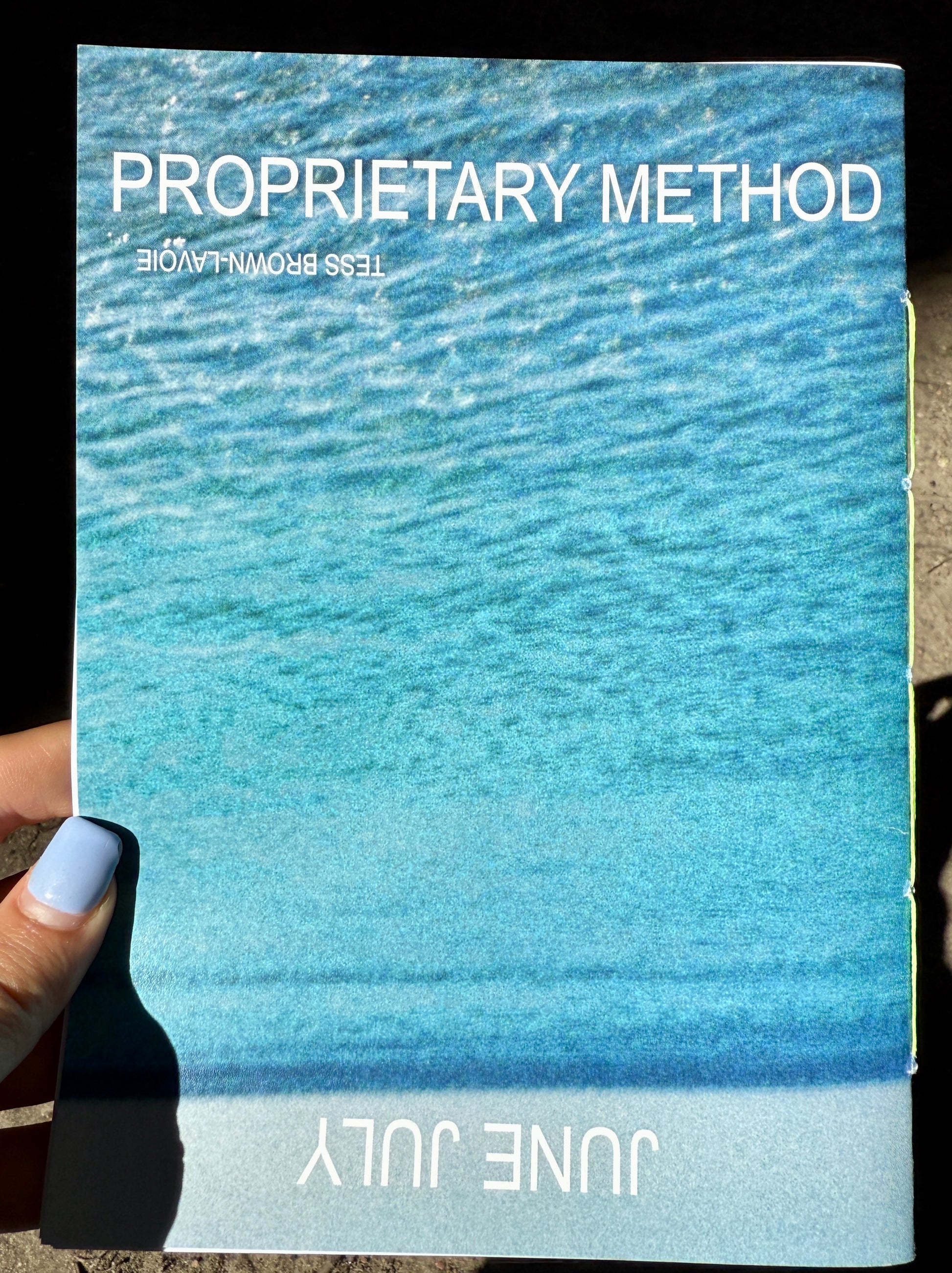 Proprietary Method / June July is a handmade chapbook written by Tess Brown-Lavoie, and produced by Cutt Press in collaboration with Chertlüdde Books. Proprietary Method (2025) undertakes the systems embedded in abstract paintings: material processes, emergent narrative, and commodity valuation. The essaying poem follows a studio visit with Tyra Tingleff in Berlin, and studies how abstract surfaces hold off meaning or conclusion in favor of durational structures: a booby trap made of desire, souped up time bauble requiring patience. Immersed in visual poetics, the painter and the reader negotiate the imminence of reluctant figuration produced by conditions of the painting: as a valuable/valued object, a time sink, an experiment, and a meter for the artist's days, life, reading, and thinking. Proprietary Method's pairing with June July (2024) further extrudes the dialogue between visual and verbal poetics and their constituent processes. Time is accounted (for) and objectified: two adjacent summers and their various liquidities, canons, affects, afterthoughts, and sensual material. Longing and its detritus are rinsed in the shores of June July, to outline possible uses for a poem made out of the distances intrinsic to life.