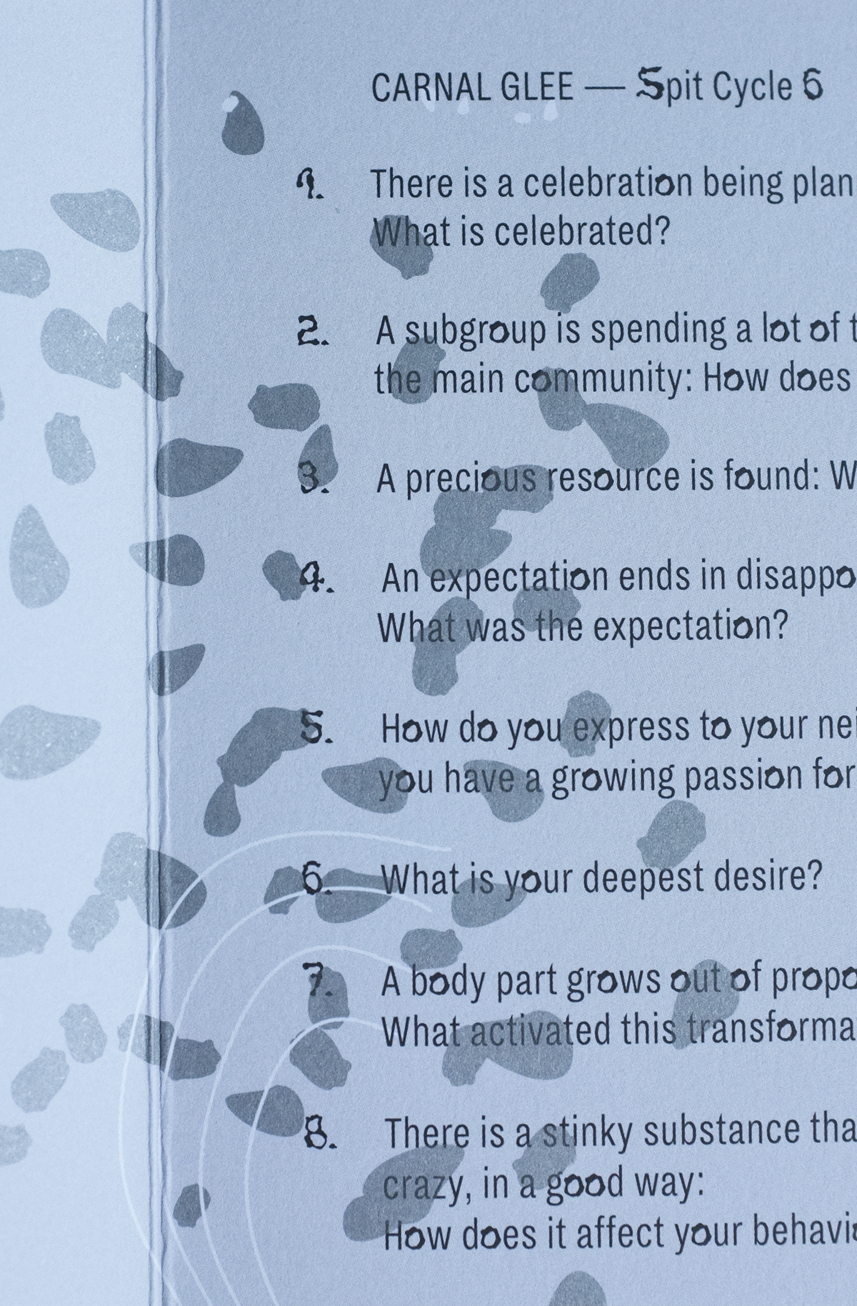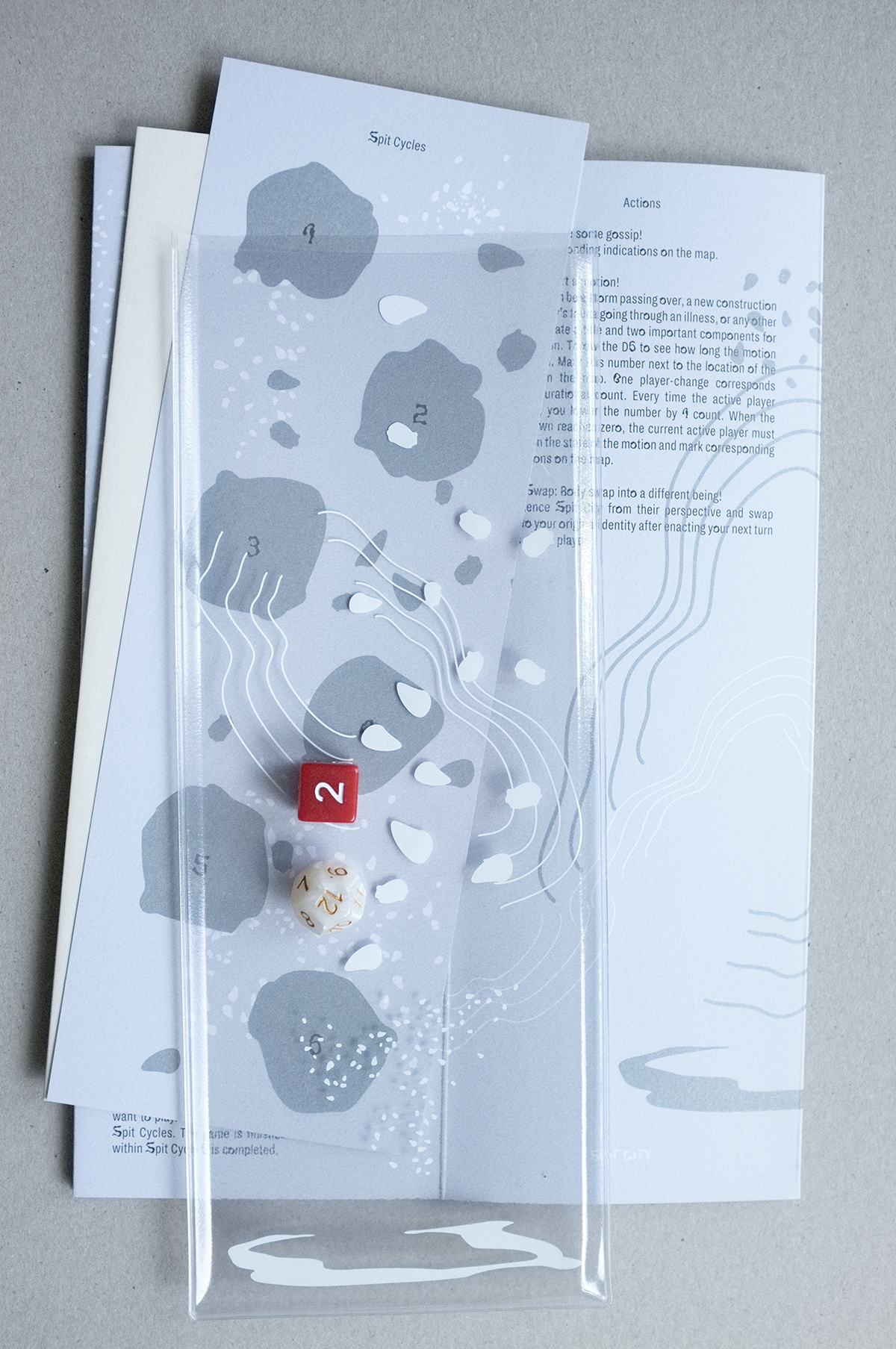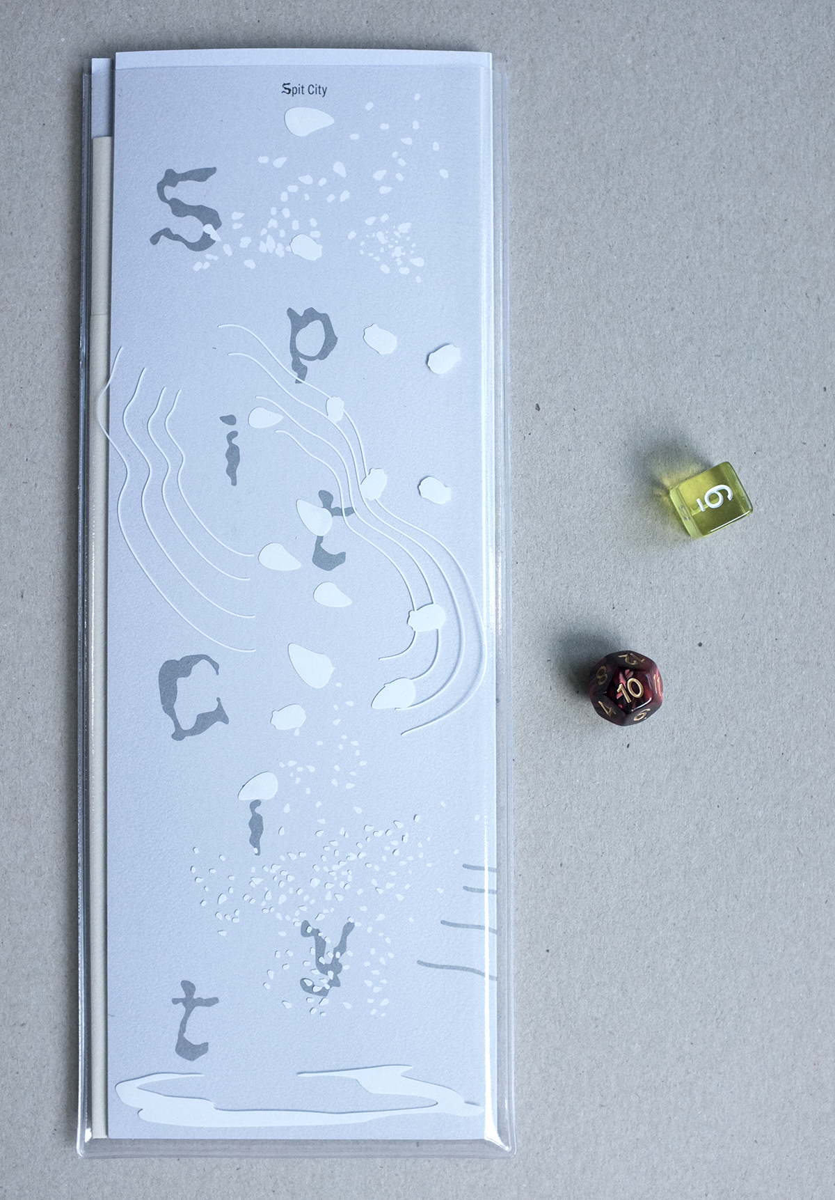 An experiential pen-and-paper game, Spit City is played with pen, paper, and dice. The ruleset is inclusive of queer trans*feminist and crip perspectives. It invites players to world a geography and their own in-game identity. The possibility of one collective identity with several players is encouraged. The only physical remnant of a playthrough is a sketched map, which captures the players’ decisions on what is traced and how it is recorded. The process assimilates the approach of feminist cartography, which is multidimensional, multiscalar, and anchored in the body. Spit City facilitates the emergence of a queer pleasure-positive ecology, other-than-human intimacies, and a carnal role play experience for 2 to 7 players. The ruleset was commissioned by transmediale festival 2023 and self-published in an edition of 200.