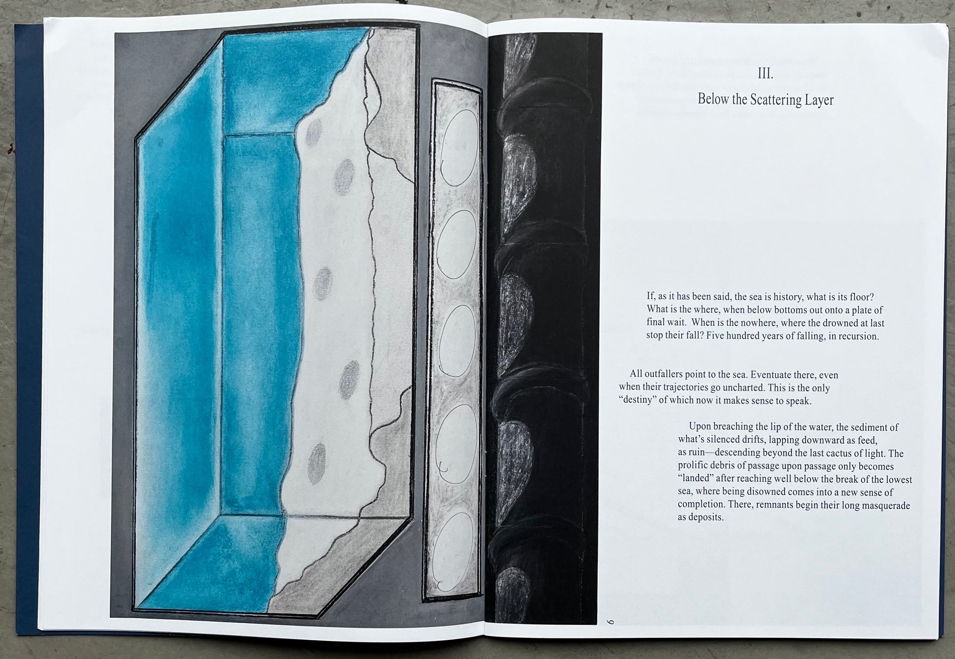 In response to these drawings, M. Ty has composed a series of short studies, or sounding lines, that listen for the echoes of what has been submerged. If the sea is history, what, then, is its floor? Treading the open waters of this question, these writings awaken a portal of recall; and they confront the Janus face of the ocean bottom—as both the bed of colonial infrastructures of communication and the illegible archive of the drowned and scattered past.
