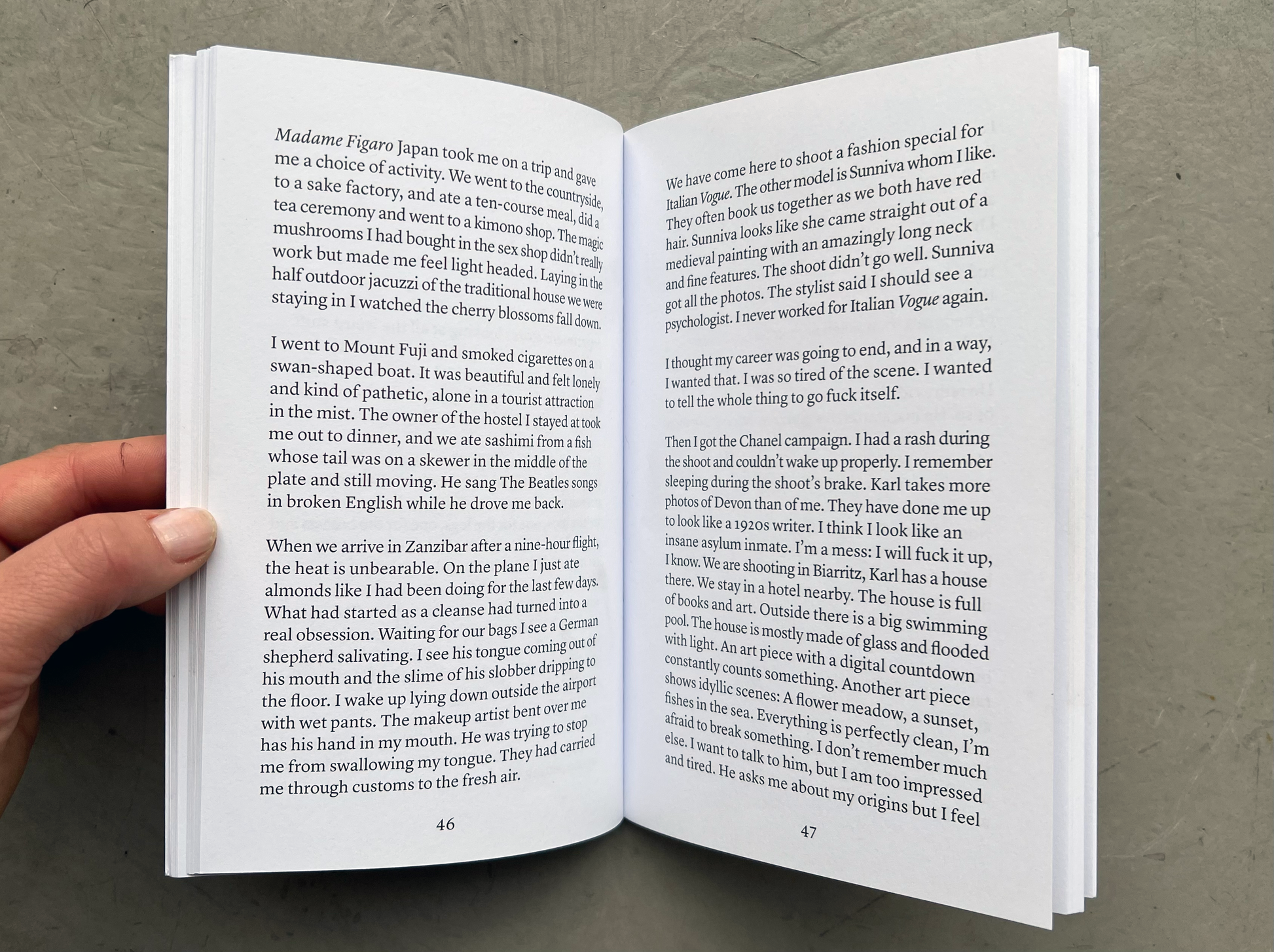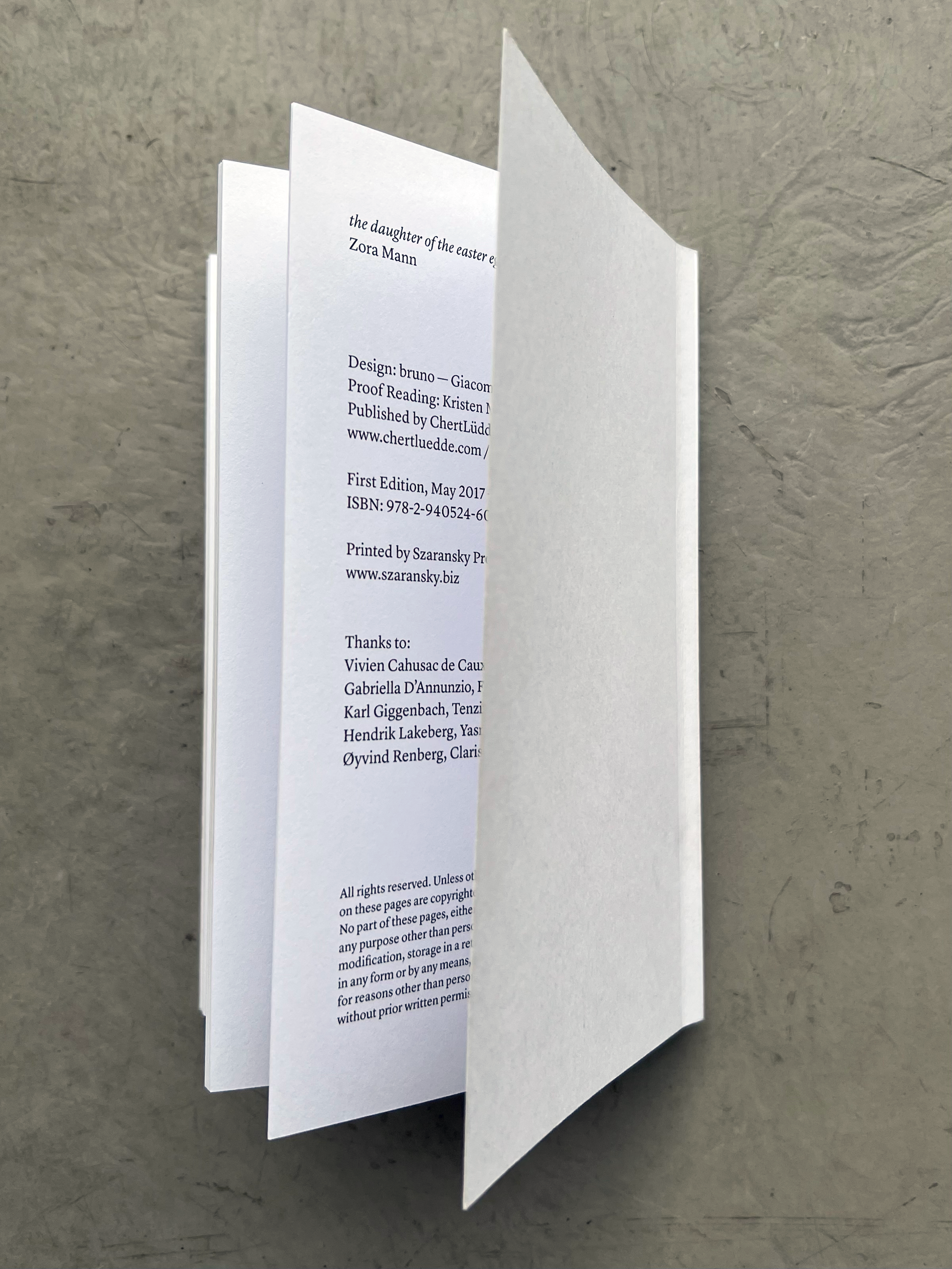 The Daughter of the Easter Egg is published in paperback format. The middle of the book holds a short text, while the rest of the pages are blank. Originally published for the artist’s installation in Art Basel Statements in 2017, the book was deliberately left almost empty to form a shell-like boundary of blank pages around Mann’s autobiographical text. Drawn from Mann’s rich life experience, the book documents the latter period of the artist’s modeling career and how her drug use sparked an episode of psychosis.