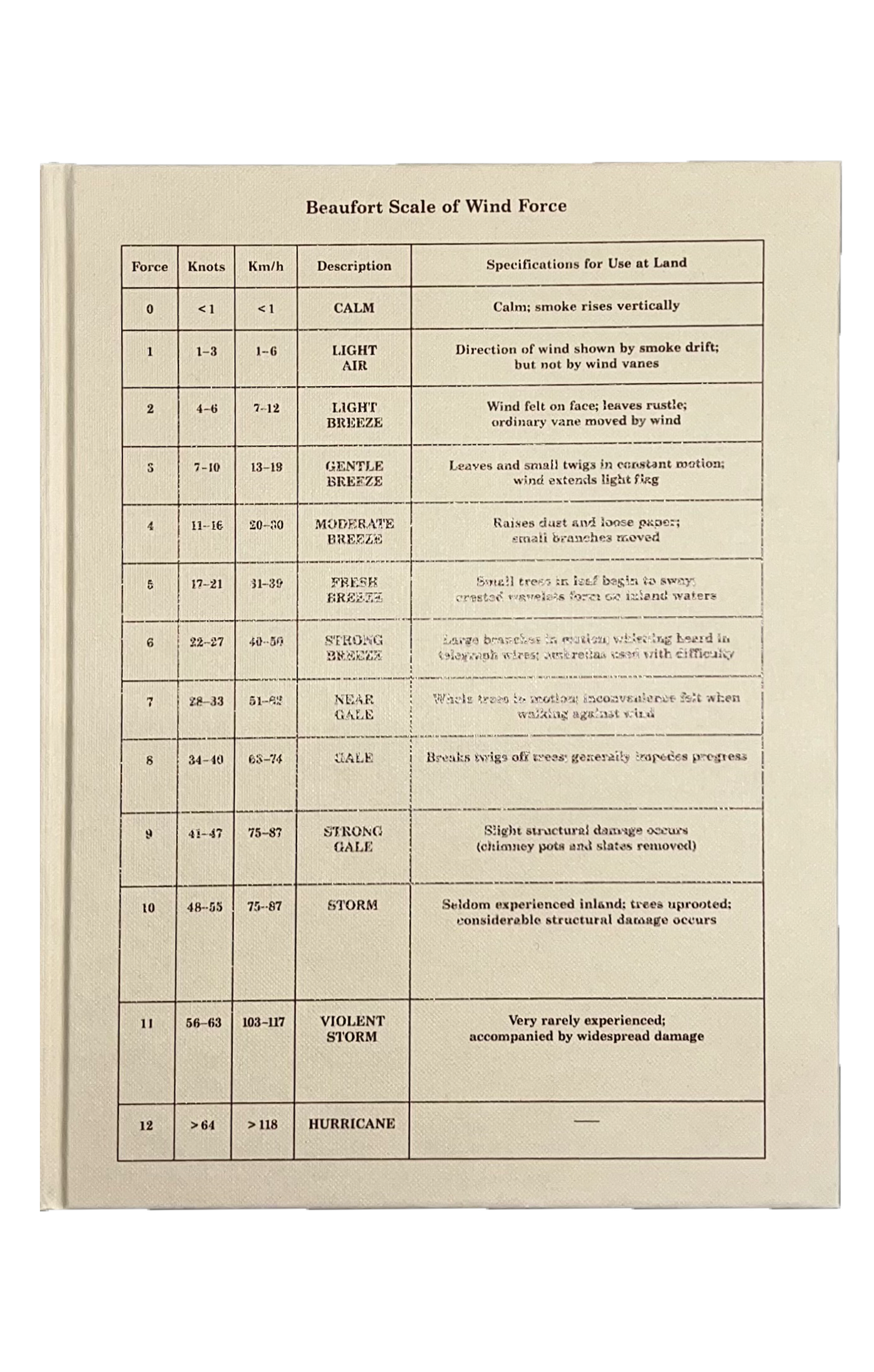 The Work of Wind: Land takes as its conceptual starting point the Beaufort Scale of Wind Force for "Use of Land"—the index of thirteen levels measuring the effects of wind force published in 1807 by British sea admiral Sir Francis Beaufort. Through its systematic organisation of observation, the scale measures the wind speed by observing how it decomposes on land (e.g. leaves are blown from trees, chimney pots lifted, houses are destroyed) and, respectively, how it composes at sea (e.g. waves are formed). This initial collection is the companion volume to the forthcoming The Work of Wind: Sea; it starts with a long introduction on decolonial solidarity and unlearning by Etienne Turpin, which is followed by a reflective essay by philosopher Allen S. Weiss. The wind scale's thirteen distinct forces are then echoed by thirteen contributions that consider the weather, the wind, and the atmosphere as planetary and political entities. Both volumes aim to foster a more intimate awareness of the relentless legacies of colonialism and capital excess that undergird contemporary politics of sustainability and climate justice. In the context of the accelerating extinction crisis, the Beaufort Scale of Wind Force thus becomes a ready-made diagram of prediction and premonition. While the books' titles might suggest a weather project, the editorial concern was not to make a project about wind, but to better understand the forces of composition and decomposition predicted on extraction, dispossession, accumulation, and infrastructure.